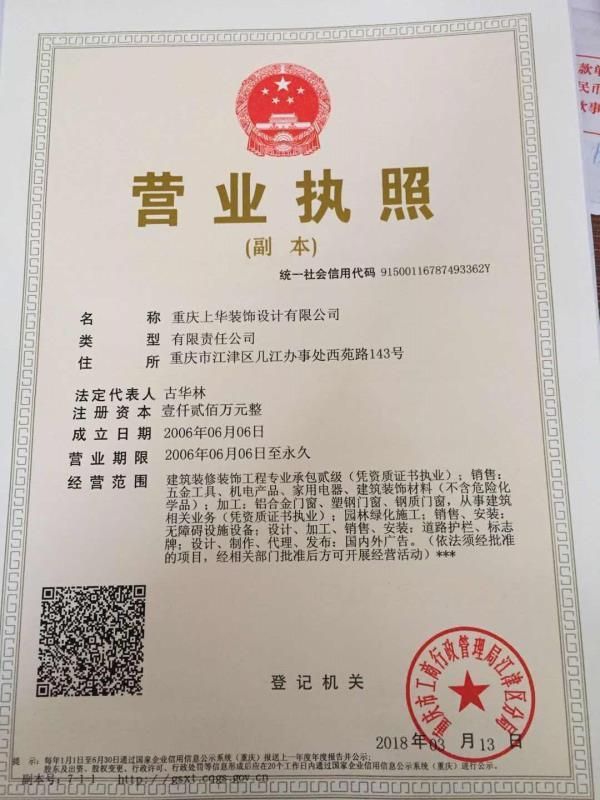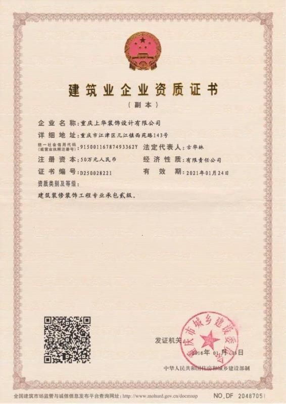 重慶上華裝飾設(shè)計(jì)有限公司創(chuàng)建于2006年6月,歷經(jīng)10多年的風(fēng)雨坎坷、開(kāi)拓創(chuàng)新,現(xiàn)已發(fā)展成為一家集公共工程和家居裝飾、設(shè)計(jì)施工為一體的國(guó)家貳級(jí)資質(zhì)企業(yè)。具有建筑裝修裝飾工程專業(yè)承包貳級(jí)資質(zhì)。