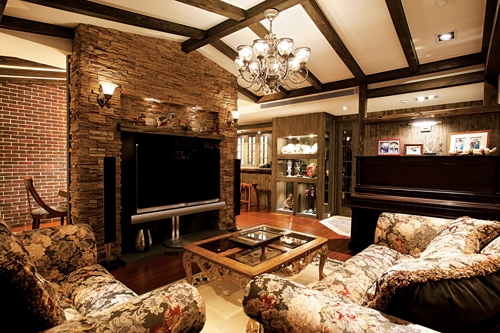 以往人們家的電視墻一般與其他墻面一樣,而現(xiàn)在往往選擇電視墻與客廳其他墻面不一樣。對電視墻進行單獨的設計與裝修,如采用紋理粗糙的文化石 鑲嵌。從功能上說,文化石可以吸音,避免音響對其他居室的影響,從裝飾效果上看,它烘托出電器產(chǎn)品金屬的精致感,形成一種強烈的質感對比,十分富有現(xiàn)代感。旁邊設置兩個櫥架擺放著主人心愛的藝術品品,點綴其間,體現(xiàn)主人的高雅氣質。