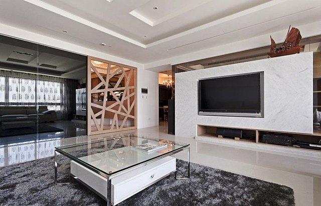 通過前衛(wèi)時尚的設計元素營造客廳的亮點空間也是目前電視背景墻的流行趨勢,比如,用玻璃或金屬等材質,既美觀大方,又防潮、防霉、耐熱,還可擦洗、易于清潔和打理,而且,這類材質的選用,多數(shù)結合室內家具共同塑造客廳的氛圍。