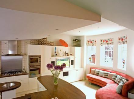【弧形沙發(fā)】這是一個(gè)單間配套的戶型,為了節(jié)省空間,設(shè)計(jì)師把廚房餐廳以及客廳巧妙的融合到了一起。這款設(shè)計(jì)的特別之處在于弧形的設(shè)計(jì),沙發(fā)背靠窗戶,減少了面積太小的壓迫感,而弧形的沙發(fā)又加大了整個(gè)空間的視覺(jué)面積,沙發(fā)特別設(shè)計(jì)的拐角讓你在看電視的時(shí)候也可以很舒適。