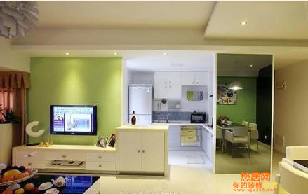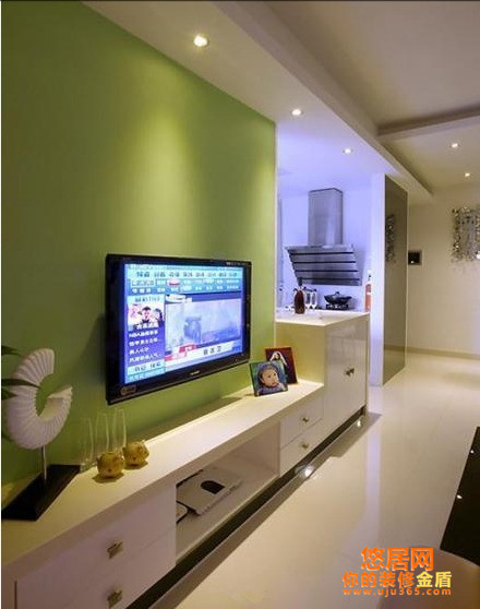 【電視墻】電視柜連接廚房的吧臺,這個設(shè)計很巧妙的延伸了客廳的視覺面積。