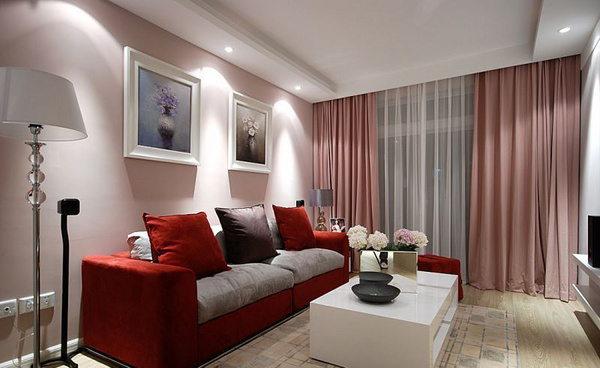 客廳背景墻簡約實用,純紅色的沙發(fā),給空間帶來喜慶的美感~