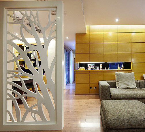而要是采用具有磨砂質感的板門,有著一種透光和朦朧強烈的視覺效果。磨砂門的裝飾效果非常出眾,能夠成為整個空間里的另一種風景。其實還可以利用些軟性的裝飾,比如線簾來進行空間的分割把就餐區(qū)和客廳明確的風格,成就了一個另類的軟性隔斷。那么,接下來我們就來欣賞一下到底什么樣的隔斷適合您的客廳吧。