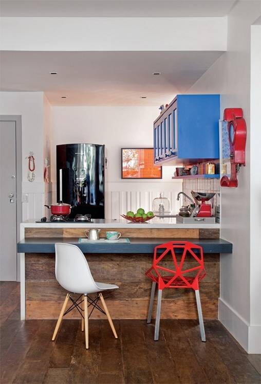 利用角落而筑成的吧臺,操作空間至少需要90cm,而吧臺高度有兩種尺寸,單層吧臺約110cm上下,雙層吧臺則為80cm與105cm,其間差距至少要有25cm,內層才能置放物品。