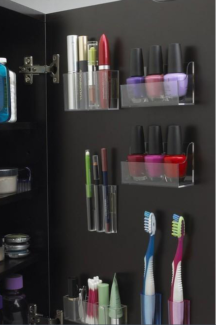 小戶型的衛(wèi)浴間如果只放一面鏡子,就太過奢侈了,還是鏡柜更加實用,方便。圖中這位姑娘真是連門板都不放過,指甲油、眉筆、睫毛膏……一目了然