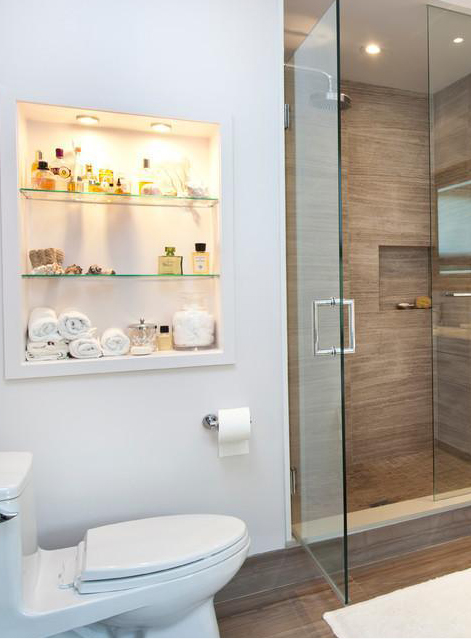這樣的擱板可以放很多雜七雜八的浴室用品,如上圖的香薰、精油等等,而且拿取方便。