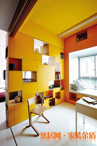 狹長的邊套房型 設計型柜體——半分割空間+全收納。具有超前衛(wèi)實驗性的設計,同時也出乎意料的美麗大方,柜體和天花統(tǒng)一的明黃用色,一體又大氣,柜體的不規(guī)則設計,現(xiàn)代性和都市性更濃。