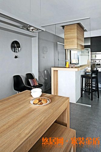 對小戶型來說最適宜的廚房設計選擇,用玻璃墻的方式圈出了廚房的區(qū)域,又不破壞整個客廳空間的完整、方正和一體。