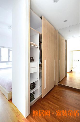 隔斷墻是很死板的,但是隔斷柜就顯得一物多用高效多了,用來隔開臥室的墻體,恰好就是一個小小的衣物收納柜,加面鏡子,一個衣物間就有了。