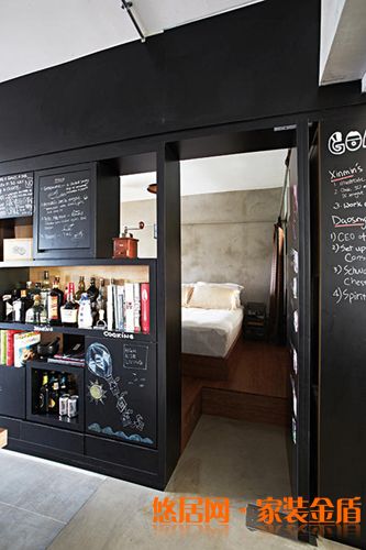 對一個小戶型來說,空間的即開即合性能越強,使用的舒適度就越高,因此在設計時,設計師一般都非常注意隔斷的靈活性,這個臥室隔斷墻體就采用了抽屜+擱架一體的設計,為的是不將隔斷做實,也能為臥室提供私密性,當然,如果你愿意折騰的話,這個隔斷墻體上的所有柜子都是能夠搬下來重新排列的,這就是妙處。