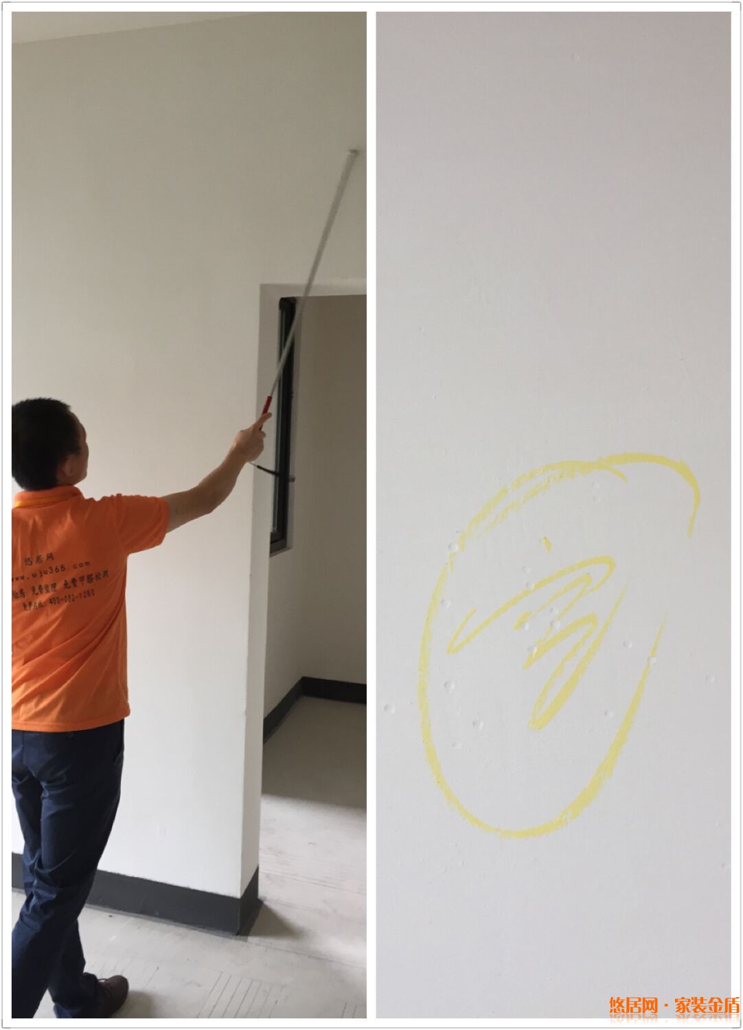 1.檢測(cè)墻面有無(wú)空鼓存在,如果出現(xiàn)大面積的空鼓就容易照成墻面開(kāi)裂、外層脫落以及墻面變色等問(wèn)題。驗(yàn)房人員用空鼓錘對(duì)墻面進(jìn)行了仔細(xì)的檢測(cè),位于2棟的熊女士的家中是出現(xiàn)空鼓問(wèn)題最多的一戶,總共檢測(cè)四處墻面出現(xiàn)了空鼓現(xiàn)象。