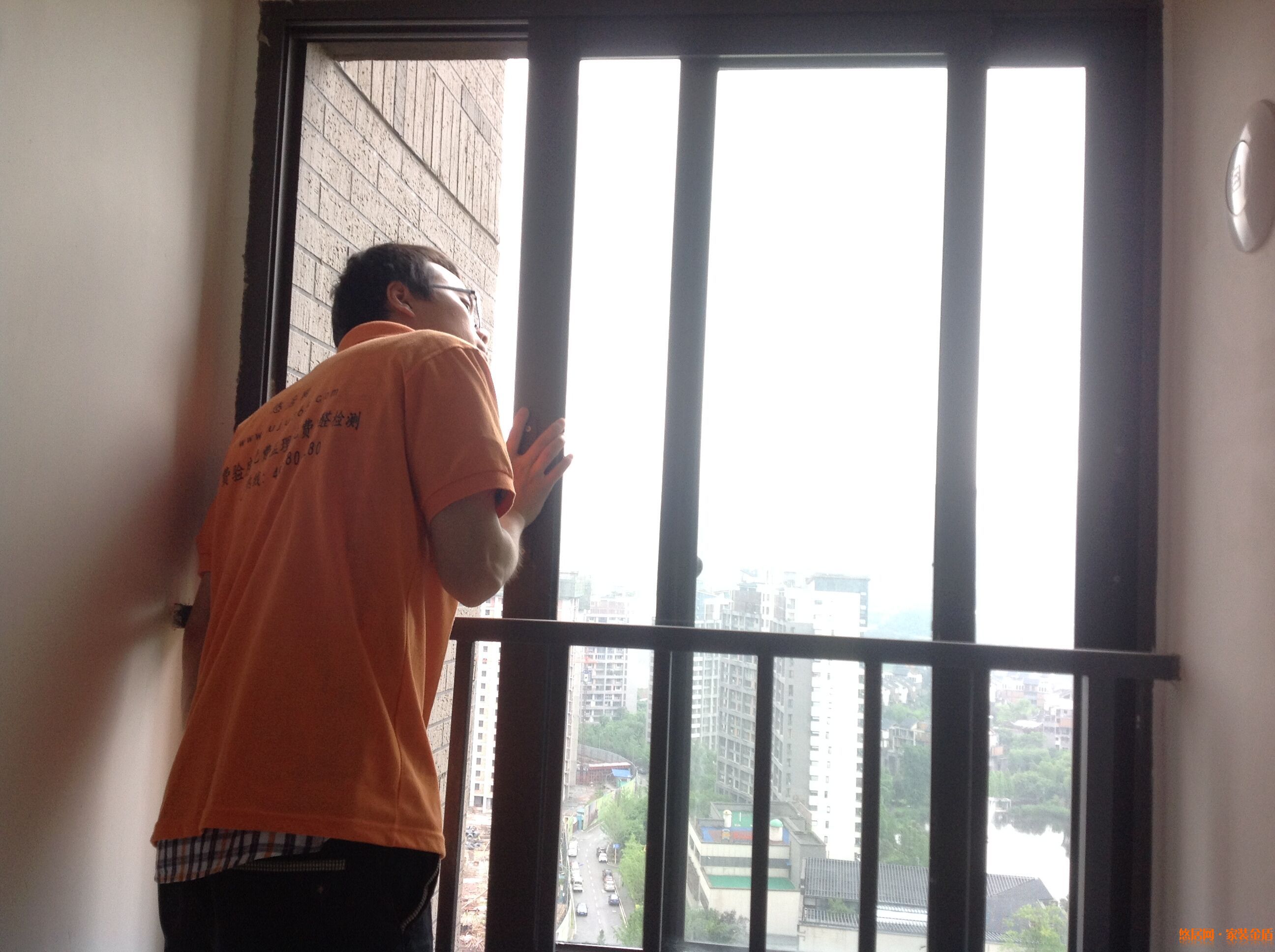 驗(yàn)房師半個(gè)身子往窗臺(tái)外伸出去檢查窗戶外沿兒的防水是否做好。我們的驗(yàn)房師也是蠻拼的!