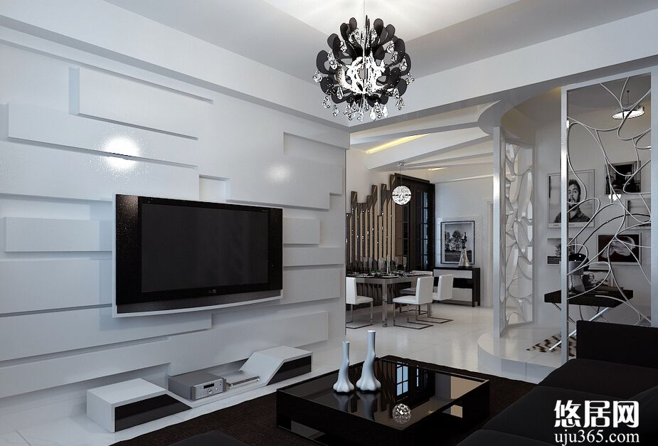 用現(xiàn)代電視背景墻做隔斷使得空間變得更加簡(jiǎn)潔,白色的電視背景墻與整個(gè)客廳那簡(jiǎn)潔的線條相融合,自由簡(jiǎn)單的造型,還為客廳增添了一種現(xiàn)代感。