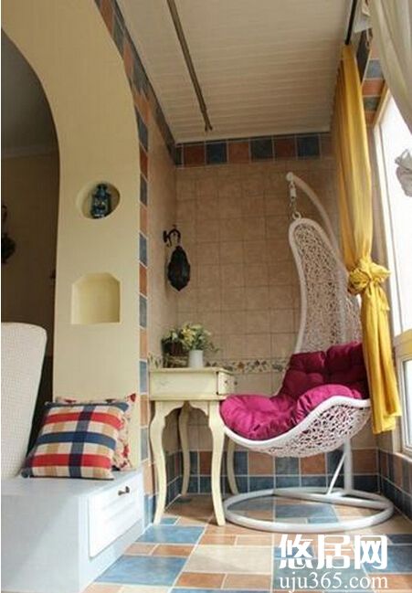 7.瓷磚的鋪貼讓陽(yáng)臺(tái)的防水性提高不少,白色的蛋形吊椅恐怕是很多朋友夢(mèng)寐以求的吧,玫瑰紅色的靠墊成為了帶有華麗典雅氣息的點(diǎn)綴,浪漫而有情調(diào)。黃色的窗簾也帶來(lái)了更加活潑的氣息。稍稍用點(diǎn)心思,就可以把陽(yáng)臺(tái)裝扮得很精致哦!