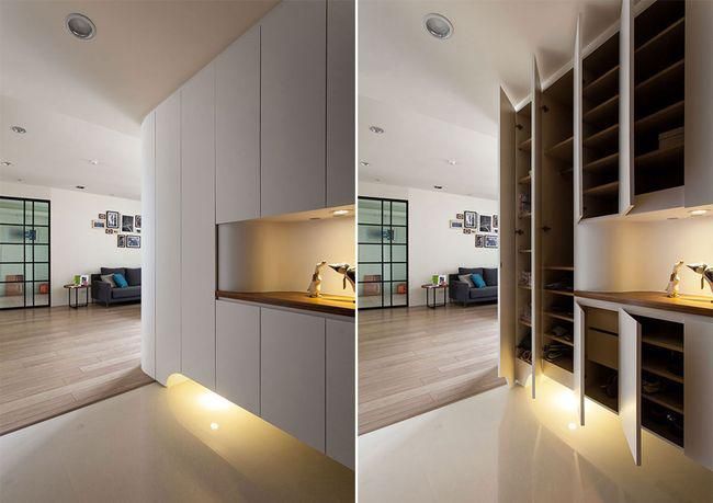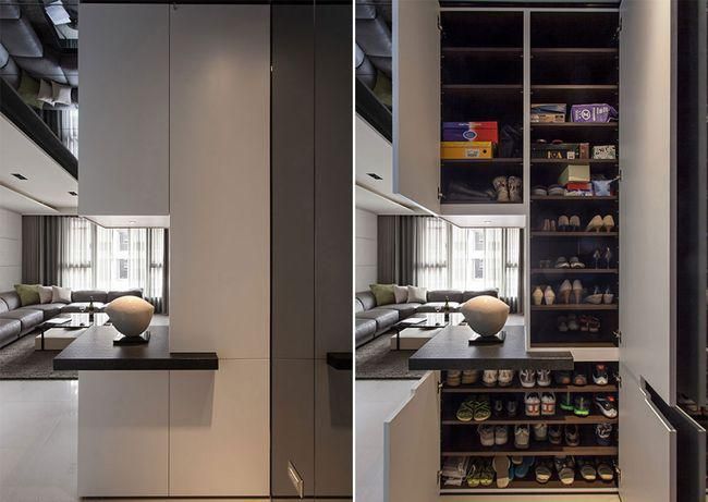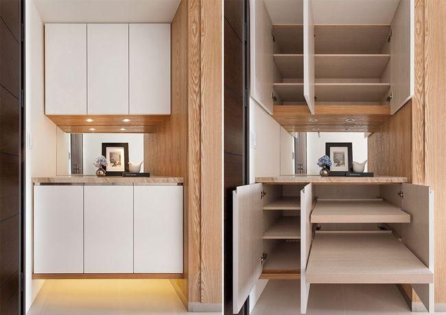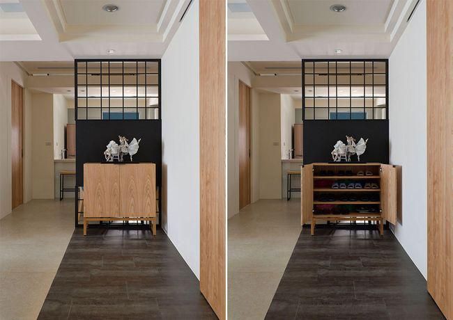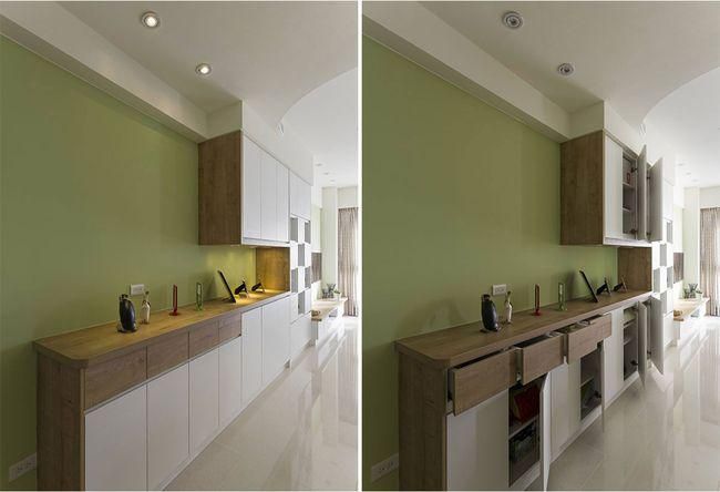 為了營(yíng)造居家視野開(kāi)展性,不想陳設(shè)大面積柜身量體,則可以陳設(shè)半腰高端景柜,平臺(tái)當(dāng)成藝品或裝飾展示,柜內(nèi)則簡(jiǎn)單提供鞋子收納,適合家庭成員較少的住家。