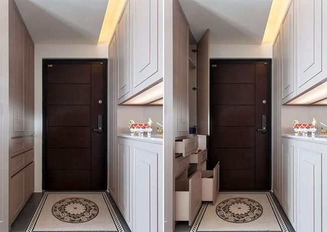 玄關(guān)占據(jù)面積雖然不大,卻必須要有“麻雀雖小,五臟俱全”的超強(qiáng)收納機(jī)能,滿足一家大小進(jìn)出家門(mén)時(shí),每個(gè)人的鞋子、衣帽、鑰匙甚至端景裝飾的擺放陳設(shè)需求。