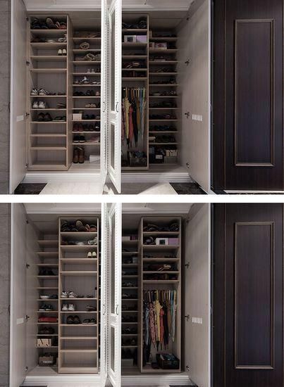 如果柜體桶深較長(zhǎng),除了設(shè)計(jì)抽拉層板,預(yù)算充足的話可采用雙層式的鞋柜設(shè)計(jì)。這樣的方便性在于柜體配置成前后兩層,大幅提升收納效益,然后后方整幅寬的收納層板,可以用來(lái)擺放較不常使用的物品,如果想拿取物品,因?yàn)榍皞?cè)層板只有一半寬度,沿著軌道能夠左右輕便挪移,所以絲毫不受阻礙。