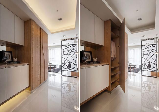 希望玄關(guān)有更多重收納機(jī)能的業(yè)主,除了鞋柜與雜物柜之外,可以規(guī)劃衣帽柜,讓造訪客人有地方懸掛外套衣帽,業(yè)主也能夠在此擺放幾件外出風(fēng)衣或外套,不必老是多跑一趟更衣室。