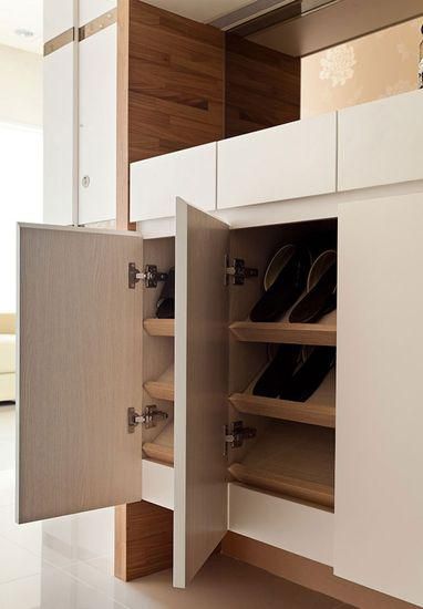 玄關(guān)兩側(cè)空間深度不夠時(shí),可以將設(shè)計(jì)巧思轉(zhuǎn)移到柜體內(nèi)部,把水平層板改為斜板,因?yàn)槭植挥蒙斓锰貏e進(jìn)去,所以適合用在收納室內(nèi)拖鞋的下柜,拿取或收放都更加便捷。