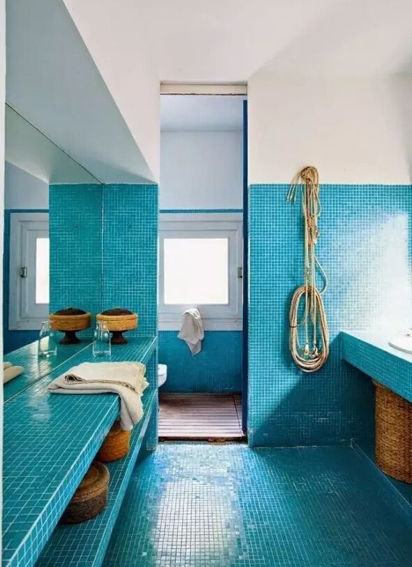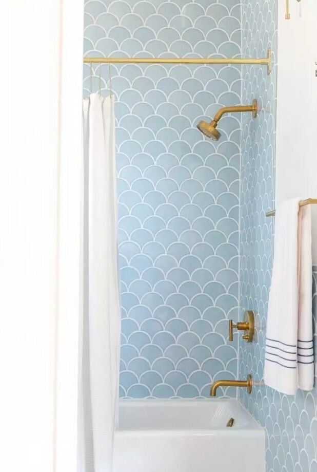 天藍(lán)色魚鱗紋磚更夢幻童真,在這種氛圍下或許更能激發(fā)想象力,洗個(gè)澡靈感涌現(xiàn)什么的。