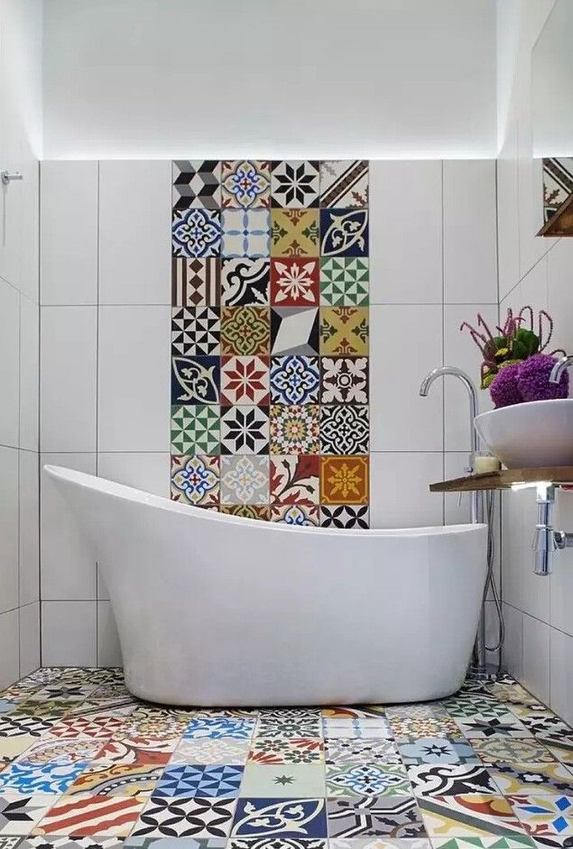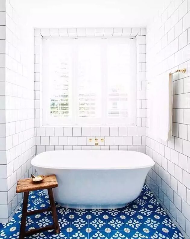 視覺效果強(qiáng)烈的花磚可以適當(dāng)在墻面上做些點(diǎn)綴。注意留白,否則過于紛亂,打擾了泡澡時(shí)安逸的思緒。