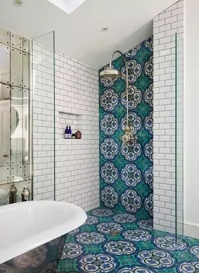 當(dāng)然,花紋磚鋪滿墻面,也是美的。但是出于氛圍的考慮,還是推薦選擇顏色淡雅些的。▼.