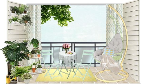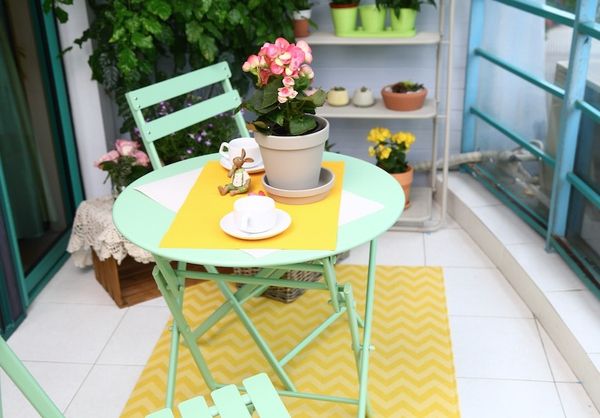 為了襯托陽臺的綠意,裝了黃色地毯與桌布