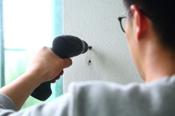 將桌椅、花草都擺好后,朋友開始在墻上打洞