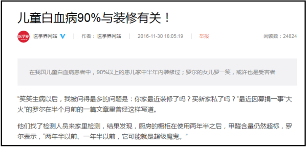 因此,某醫(yī)學(xué)大V就因此分析,白血病的誘因是裝修引起的。并通過(guò)各大媒體,發(fā)表長(zhǎng)文《震驚!兒童白血病90%源于裝修》,引起網(wǎng)絡(luò)瘋傳。