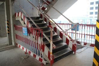 (3)分層施工的樓梯口和梯段邊,必須安裝臨時(shí)護(hù)欄。頂層樓梯口應(yīng)隨工程結(jié)構(gòu)進(jìn)度安裝正式防護(hù)欄桿。