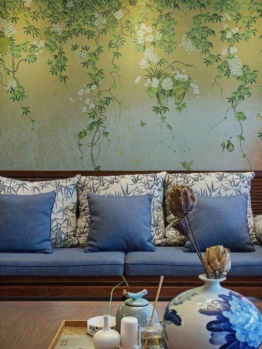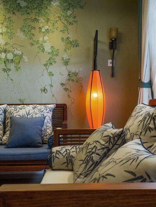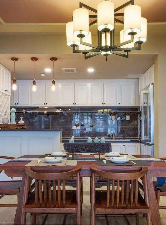 開放式格局下,木質(zhì)家具環(huán)繞式的擺放抱枕上青花勾勒的竹子與桌上一色瓷器交相輝映。背景墻上的葡萄藤凌亂交錯著兩個時代。規(guī)劃出客廳的空間,依稀看見坐在主位的長輩和膝下活潑的幼兒們的天倫。餐廳和客廳像兩個時代一樣被打通,頂上八角燈金屬和玻璃的融合,總算是找到了些今昔的滋味。