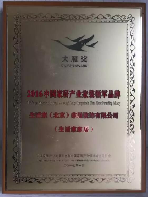 導(dǎo)讀:生活家榮獲“大雁獎”2016中國家居產(chǎn)業(yè)家裝領(lǐng)軍品牌。