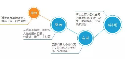 先解釋一下概念,垂直電商在這里指的是一站式裝修服務(wù)平臺(tái),擁有線上線下流量入口,運(yùn)營(yíng)新模式、新思路、新技術(shù)向客戶提供設(shè)計(jì)、主材、施工、售后等一體化垂直服務(wù)流程的互聯(lián)網(wǎng)整裝;后市場(chǎng)服務(wù)則主要面向存量市場(chǎng)的家庭維修,安裝,翻新等業(yè)務(wù);軟裝定制也就是滿足用戶個(gè)性化需求,量身制作,提供定制化裝飾服務(wù)。