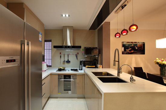 如果房間層高比較高,也可以在開放式廚房的正中使用吊燈,四周環(huán)繞射燈。燈的造型一定不要太復(fù)雜,以免給日后的清潔工作帶來(lái)麻煩。
