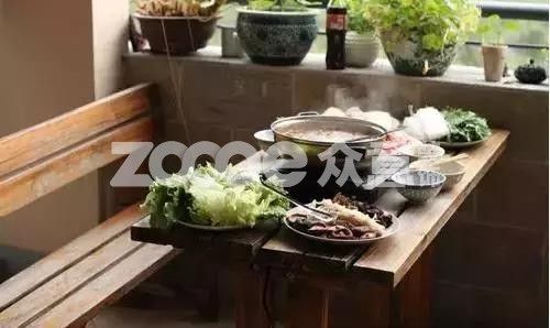 幾盤綠植,一張長桌,公園長椅,火鍋吃起來