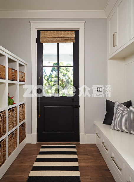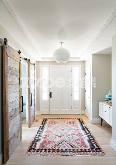 針對于寬敞的雙門型玄關(guān),可以大膽搭配,橫向北方的橫向線條大地毯,顏色上,可以根據(jù)室內(nèi)配色,選擇,室內(nèi)配色較為素雅,那么可以選擇明快的顏色做到活躍氣氛的效果,尺寸上,適量延伸,以超過門的寬度為底線。
