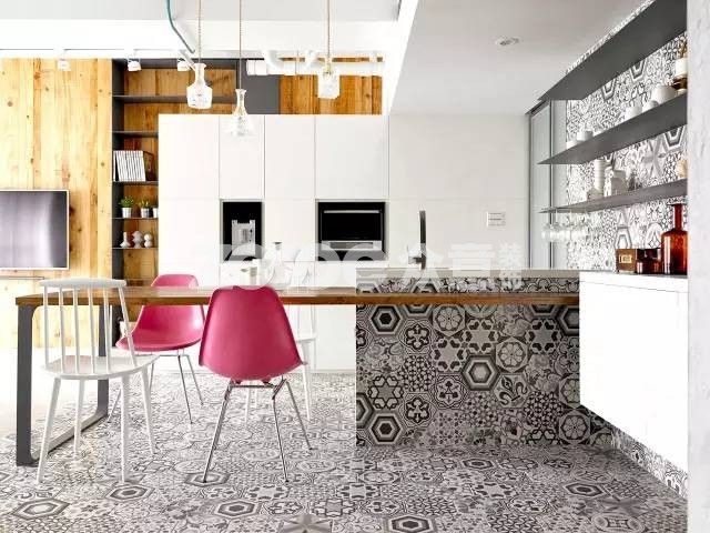 六邊形和四邊形這種幾何磚作地毯式鋪貼,不但造型更多變而且可以利用色彩間的對比,隨心所欲地搭配出自由隨性的空間裝扮。