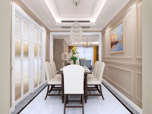 餐廳的裝修設計跟隨客廳設計,造型簡約,減少雕花等復雜的裝飾,采用線條裝飾,同時,空間色彩統(tǒng)一,在視覺上十分連貫。