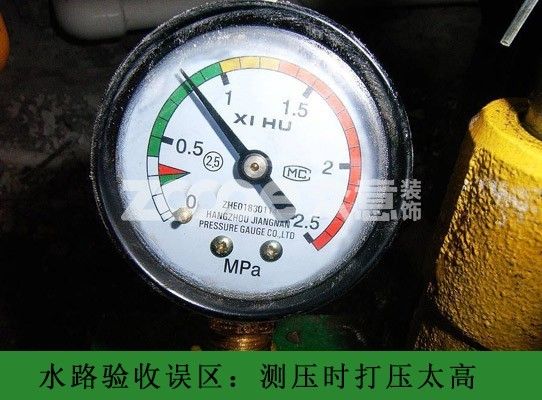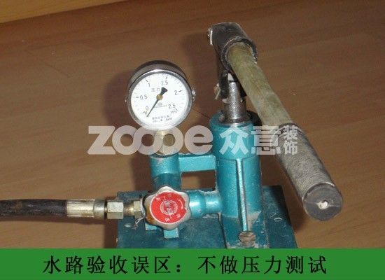 一些業(yè)主為了測試水路承受壓力,將水壓打得很高。但這樣可能會讓管道超過其承受的極限,反而會導(dǎo)致將來出現(xiàn)漏水的危險(xiǎn)。正確的方法是,用試壓泵對水管進(jìn)行打壓試驗(yàn),一般試壓壓力要不低于0.6MPa,一般為0.8MPa,壓力有一定的范圍,并非加的壓力越大越好。
