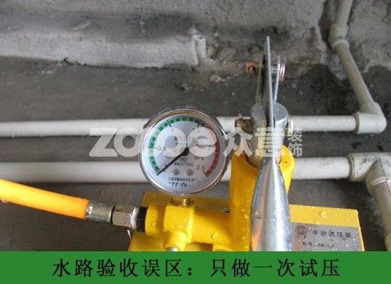 一些業(yè)主在驗(yàn)房的時(shí)候,往往出現(xiàn)這樣的誤區(qū),認(rèn)為水路只需要測試一次。其實(shí)只試一次壓并不能完全判斷水路是否正常使用,因?yàn)槭状未驂壕o將管道空氣排出。而多次打壓,能夠不斷地試驗(yàn)出準(zhǔn)確的水路情況。