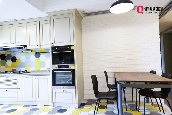 設(shè)計師對于餐廳、廚房采用開放式裝修,開放式的廚房讓整個空間更開闊,拼磚的色彩和樣式也讓整個廚房和餐廳更有特色!