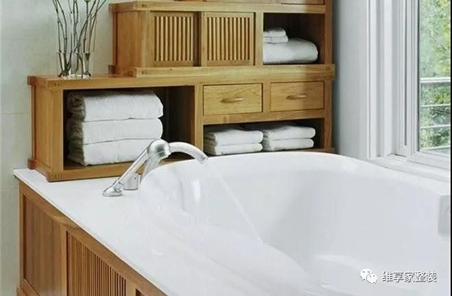 在功能區(qū)的部分,最靈活的無(wú)疑是擱架收納了。將擱架放置在浴缸的上面,多層分隔擺放,將靈活體現(xiàn)到極致。