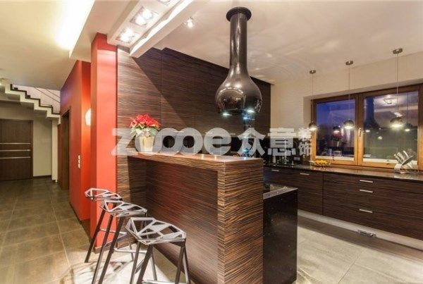 有些開放式餐廳也與客廳相連,做一個造型簡單大方的吧臺隔斷,或放置一個酒柜,也不失為一種經(jīng)濟實用的設計。