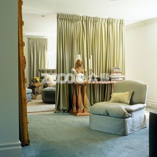 作為一種軟隔斷,色澤漂亮的簾幕將臥室分割成幾個不同機能的小空間。如需要,布簾隔斷就可以任意開啟,是彈性隔開臥室睡眠空間和公共空間的理想形式。