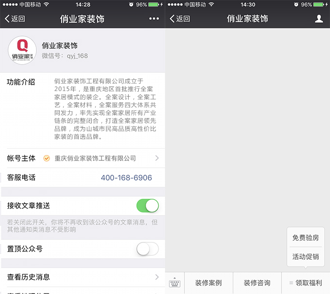 重慶裝修公司俏業(yè)家裝飾自成立初期,就已經(jīng)開通了官方微信訂閱號。簡潔清爽的底部菜單欄,清晰明了。而且由于是微信公眾號,非APP程序,所以不耗手機(jī)內(nèi)存。