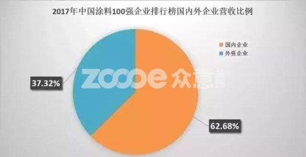 在2017年中國涂料100強排行榜中國內(nèi)涂料只占了37.32%。