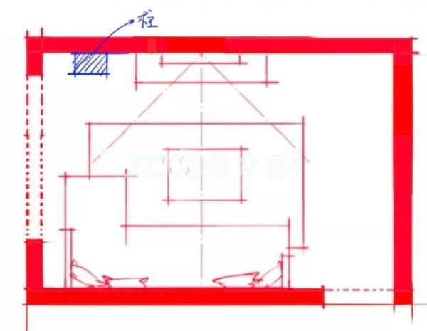 如上圖,當長邊的這一面墻有柱子的時候,若是擺沙發(fā)就要不能靠墻擺放了,這個時候有柱子的一側更適合做電視墻了。