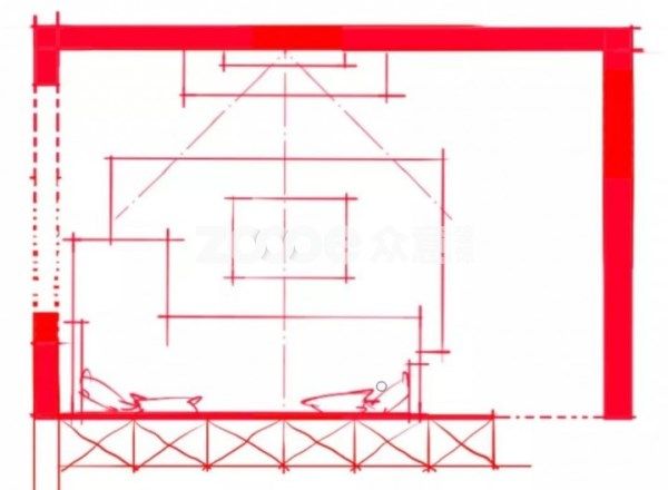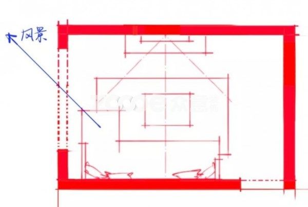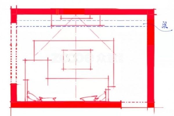 如上圖,當長墻一側上方有較高的梁的話,那么也是不適合擺沙發(fā)的,因為這樣會讓坐在沙發(fā)上的人感受到壓抑。