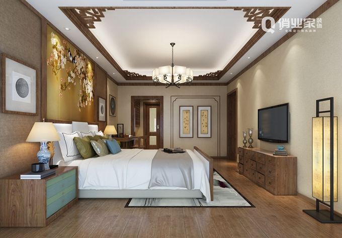 2、新中式風(fēng)格:新中式風(fēng)格的選材更加的廣泛,材質(zhì)多運(yùn)用現(xiàn)代裝飾:壁紙、?;u、軟包背景墻等,再以木線條和實(shí)木家具作為點(diǎn)綴。