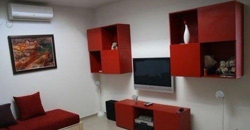 客廳電視背景墻:電視機(jī)兩端是方形掛壁式收納柜,有無柜門以對角為劃分,組合單元的紅色與紅色沙發(fā)相映成趣,轉(zhuǎn)增個(gè)客廳顯得十分喜慶。